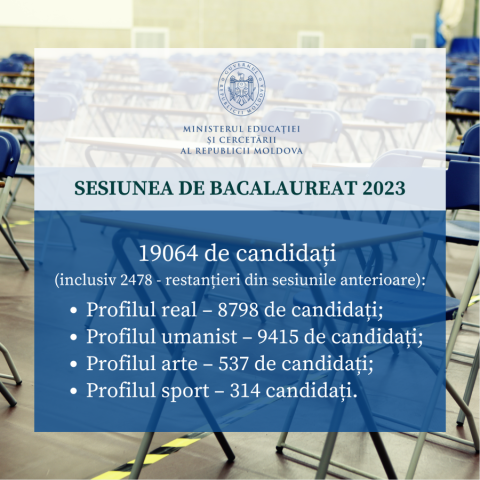 Din numărul total de candidați care s-au înscris pentru susținerea examenului național de bacalaureat 12468 sunt din licee teoretice, 6130 – colegii/centre de excelență, instituții de învățământ superior – 287, externat – 179.