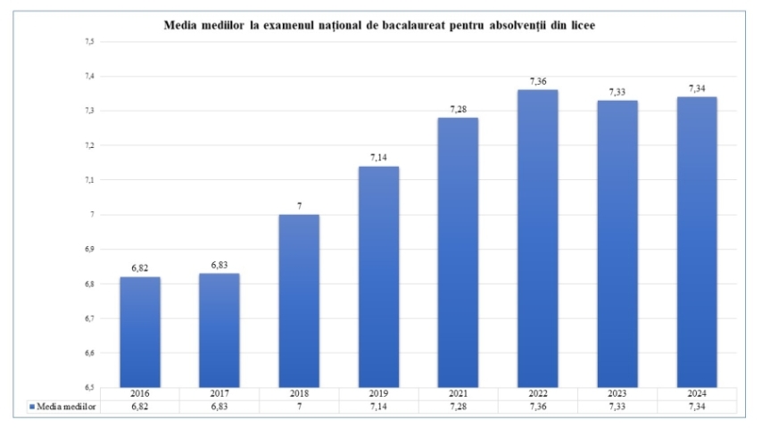Media mediilor obținută de absolvenții din licee în sesiunea 2024 nu s-a modificat față de cea înregistrată în sesiunea 2023. Astfel, pentru candidații din licee, media mediilor la examenul național de bacalaureat 2024 este 7,34, comparativ cu 7,33 în 2023.